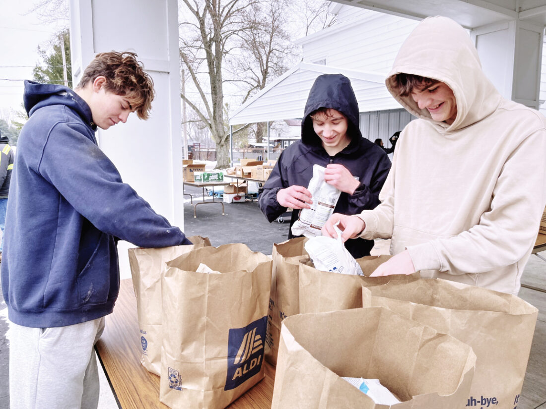 Staff photo / Bob Coupland Bristol High School Beta Club members, from left, Ethan Clark, senior, Josh Musson, junior, and Logan Briggs, sophomore, help load food donations into bags at a recent food distribution at Wildare Church. The students are gaining community service hours before attending an upcoming state Beta Club convention.