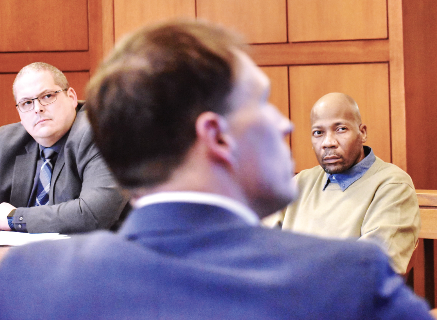Staff photo / Ed Runyan Defense attorney Aaron Meikle, left, and his client, Kenyon D. Kellum, 52, watch a video Monday of the confrontation between Kellum and another man in November in Niles while Trumbull County Assistant Prosecutor Kevin Trapp plays the video. Kellum is on trial for attempted murder and other charges.