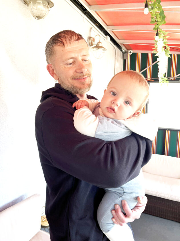 Staff photo / Bob Coupland Donald Durkin of Girard holds his 8-month-old son, Daniel, on Sunday at a fundraiser at Margherita’s Grille in Girard to raise funds for his family who lost their home and belongings in a fire in February. The fundraiser was held to assist the family in finding a new home.