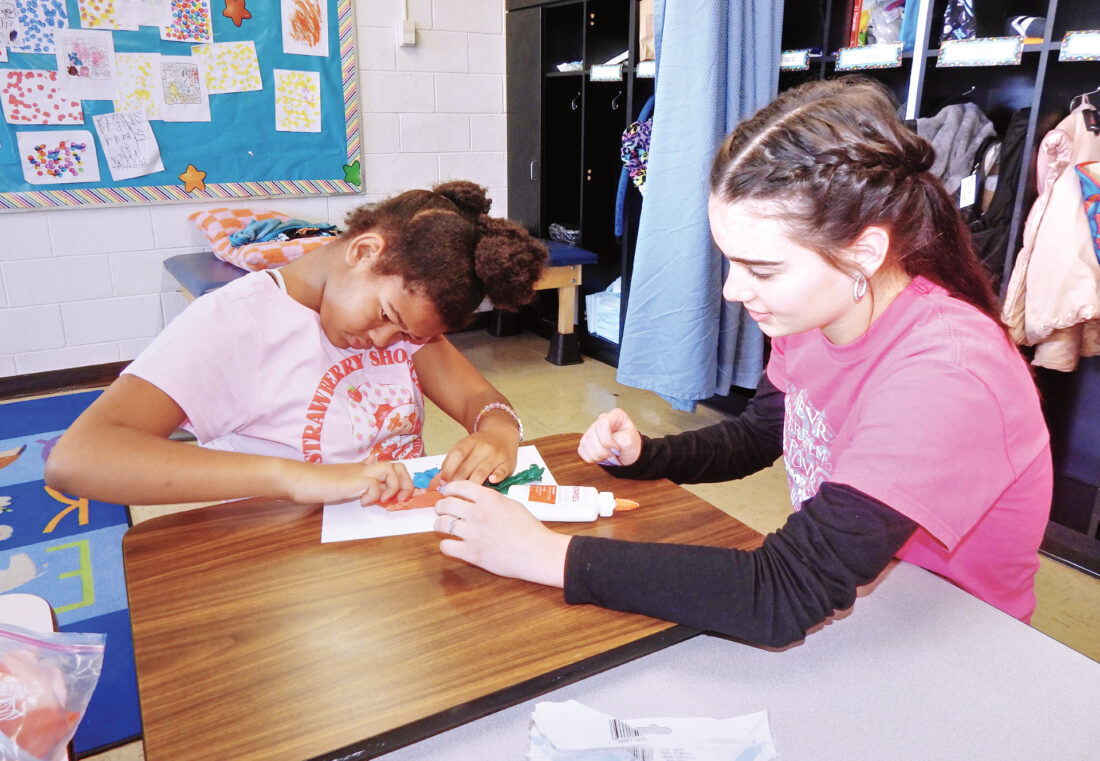 Correspondent photo / Nancilynn Gatta Neveah Maiden, 12, of Warren, colors while Gabby Reese, a junior at Hubbard High School and a member of the Future Educators of America, assists her Tuesday morning when the FEA members worked as classroom aides at Fairhaven School in Niles.