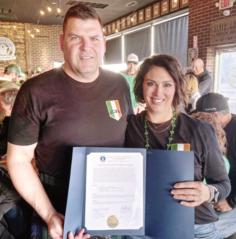 Submitted photo Steve Murphy and Lynsey Cayton hold the signed scholarship agreement for the Trooper Nicholas P. Cayton “231” Memorial Scholarship at the Youngstown State University Foundation. Cayton was killed Oct. 16 after his cruiser was struck from behind by a semi on state Route 11 in Canfield while he was assisting another truck driver.