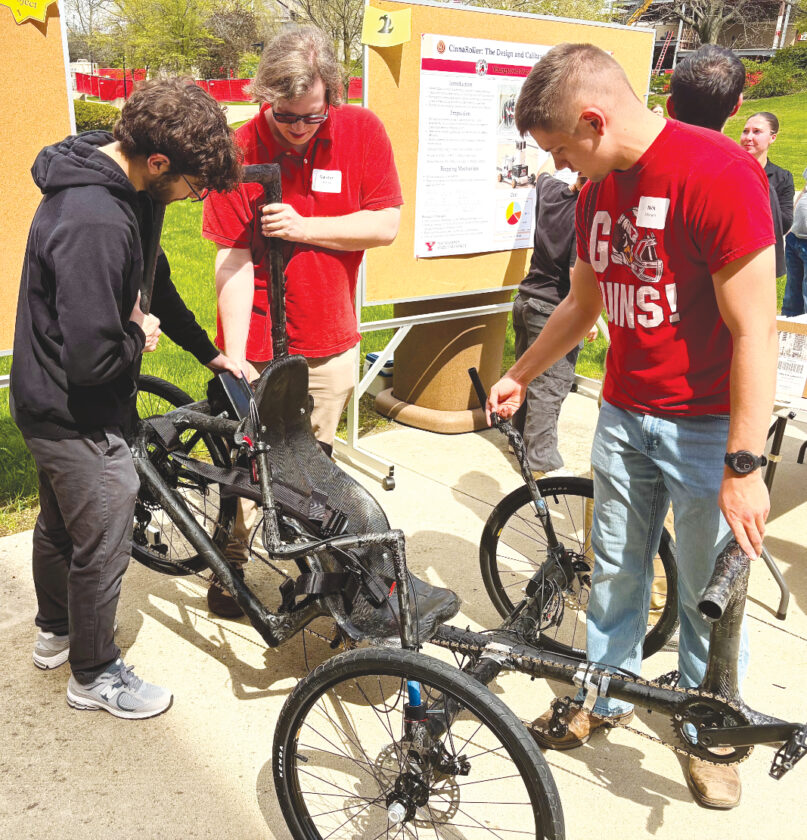 Correspondent photo / Sean Barron From left, Youngstown State University students Dylan Fellitz, Quenten Hamey and Nick Johnson look over the E-Human Powered Vehicle they designed this year, which will be in a competition Saturday in Orlando, Florida. Not pictured is Jack Johnson, the group’s fourth member and no relation to Nick Johnson.