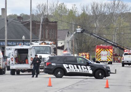 Staff photo / Ed Runyan Girard city firefighters, pictured in the background, attack a house fire Wednesday morning on North Main Street.