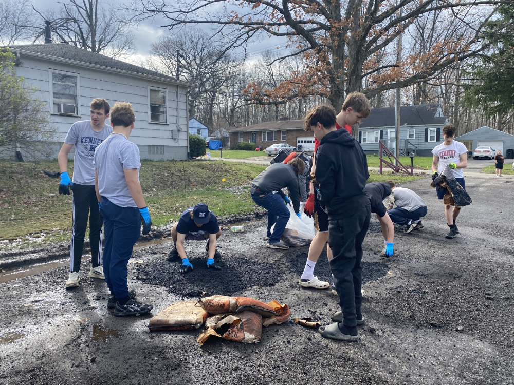 Twelve varsity Eagles players, head baseball coach Jim Ciambotti, pitching coach Carmen DeChristofaro and assistant pitching coach Joey Cananna were led by White Oak Health Care Administrator Michael Wittmann in helping to repair potholes in the parking lot and picking up branches on the property that were knocked down in recent windstorms.