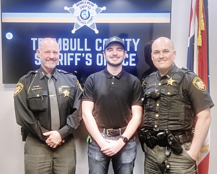 Correspondent photo / Chris McBride Trumbull County Sheriff Mike Wilson, left, Youngstown State University criminal justice student and intern Ben Phillips, middle, and Detective John Dina pose together at the Trumbull County Sheriff’s Office.