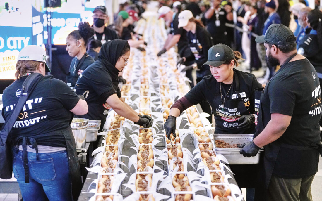 AP Volunteers assemble cheesesteaks Tuesday in a Guinness World Record attempt on National Cheesesteak Day at Philadelphia International Airport in Philadelphia.