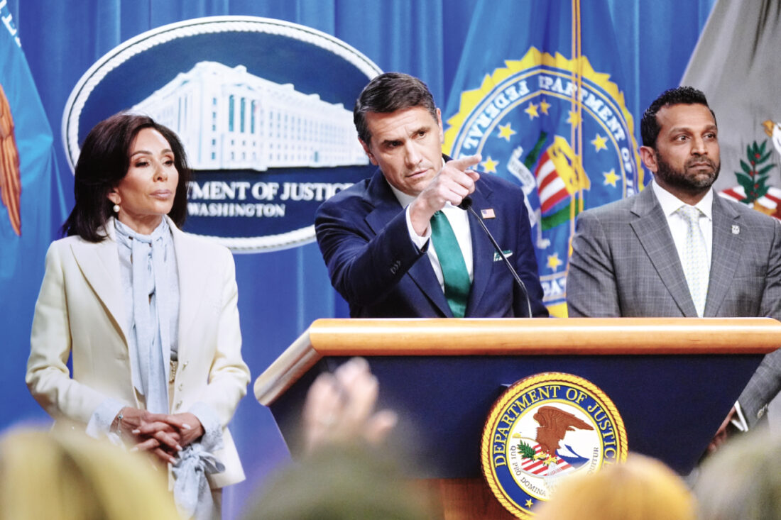 AP Acting Attorney General Todd Blanche, with U.S. Attorney Jeanine Pirro, left, and FBI Director Kash Patel, right, speaks during a news conference at the Department of Justice, on Monday in Washington, following the initial appearance in federal court of the suspected White House Correspondents Dinner gunman, Cole Tomas Allen of Torrance, California.