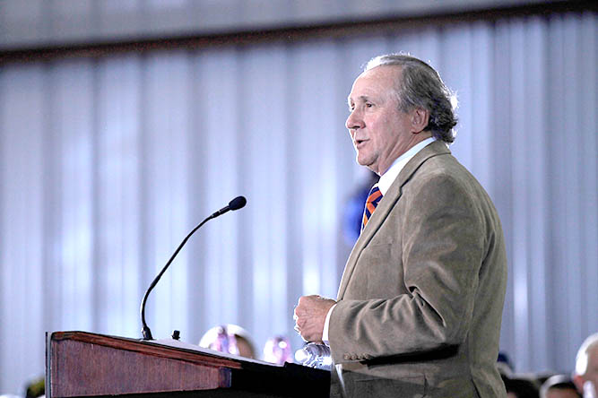 FILE - Michael Reagan, the son of former President Ronald Reagan, introduces Republican presidential candidate, former House Speaker Newt Gingrich during a campaign stop, Jan. 30, 2012, in Pensacola, Fla. (AP Photo/Matt Rourke, File)