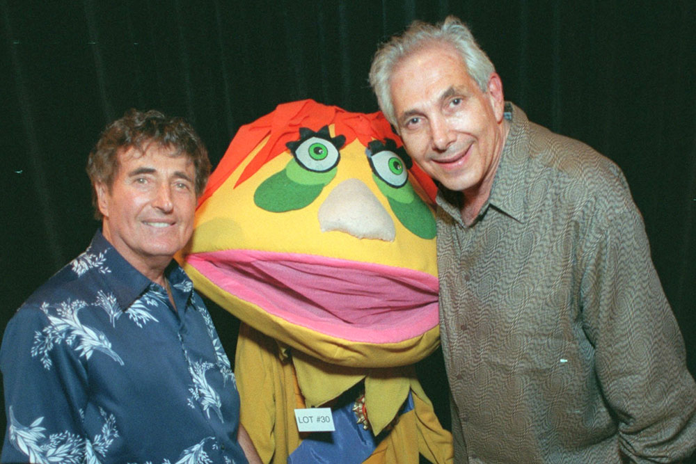 FILE - Puppeteers Sid Krofft, left, and Marty Krofft stand next to H.R. Pufnstuf, one of their many creations, at an auction in Beverly Hills, Calif., on Aug. 23, 1998. (AP Photo/John Hayes, File)