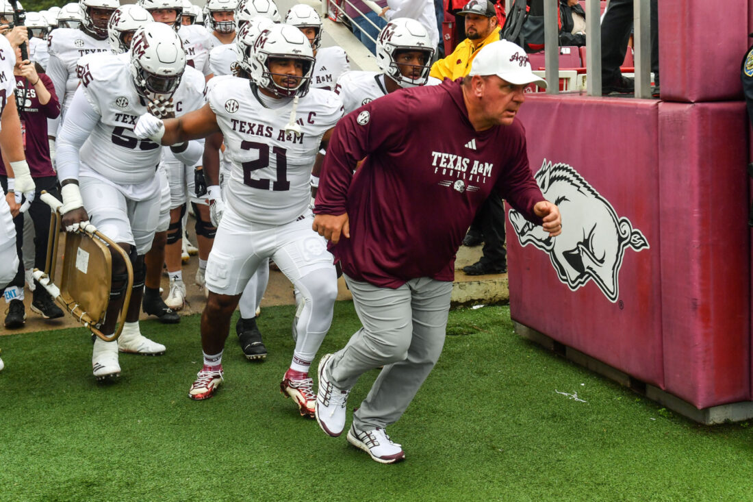 Texas A&M's Mike Elko leads his team onto the field to play Arkansas during an NCAA football game on Saturday, Oct. 18, 2025, in Fayetteville, Ark. (AP Photo/Michael Woods)