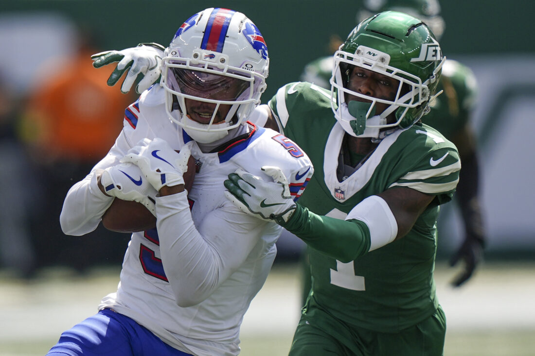 Buffalo Bills wide receiver Joshua Palmer (5) makes a catch against New York Jets cornerback Sauce Gardner (1) during the first quarter of an NFL football game, Sunday, Sept. 14, 2025, in East Rutherford, N.J. (AP Photo/Frank Franklin)