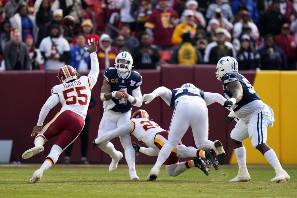 After Prescott threw a 7-yard touchdown pass to tight end Jake Ferguson on the game’s opening drive, Johnson went 3 for 3 for 68 yards to get Washington to 7-3. The key play was a 41-yard completion to Deebo Samuel, Johnson’s longest since 2018. Samuel finished by running into Donovan Wilson, knocking the safety’s helmet off.
