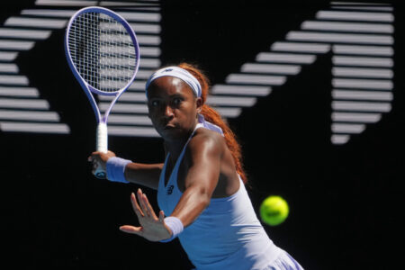 Coco Gauff of the U.S. plays a forehand return to Olga Danilovic of Serbia during their second round match at the Australian Open tennis championship in Melbourne, Australia, Wednesday, Jan. 21, 2026. (AP Photo/Asanka Brendon Ratnayake)