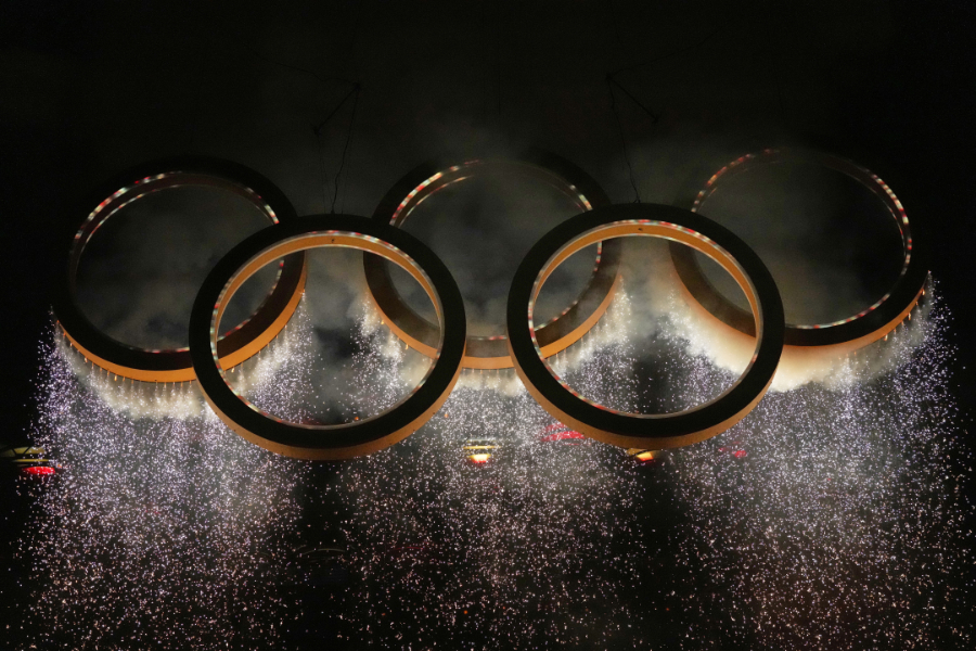 The Olympic rings are lit up during the Olympic opening ceremony at the 2026 Winter Olympics, in Milan, Italy, Friday, Feb. 6, 2026. (AP Photo/Natacha Pisarenko)