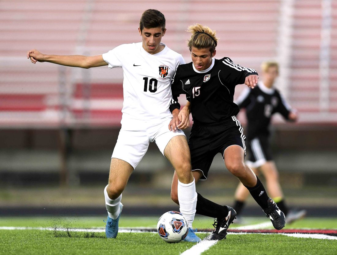 Correspondent photo / Robert Hayes Pano Gentis (left) of Howland and Eddie Russo (right) of Canfield battle for the ball at midfield during the first half at Canfield High School.