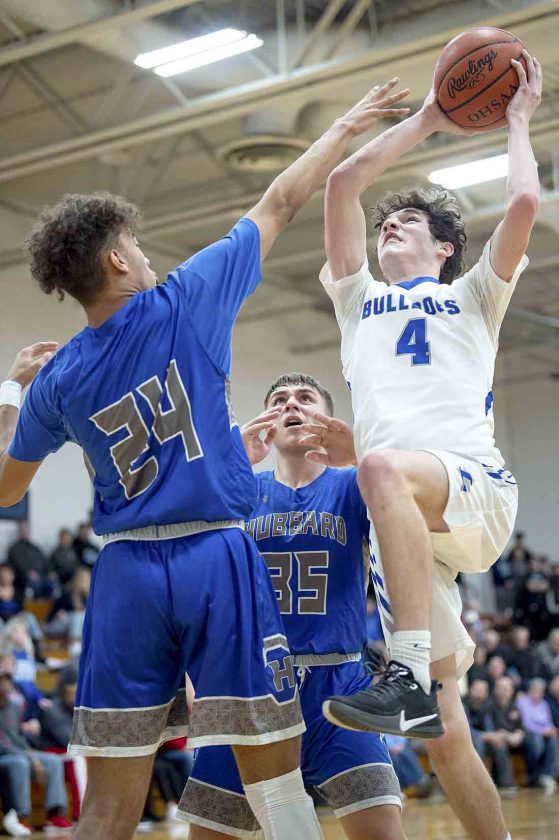 - Correspondent photo / Dianna Oatridge — Lakeview’s Nate Fox (4) puts up a shot as between Hubbard defenders Alec Ford (24) and Nick Matisi (35) during their first round sectional tournament game in Cortland on Tuesday.