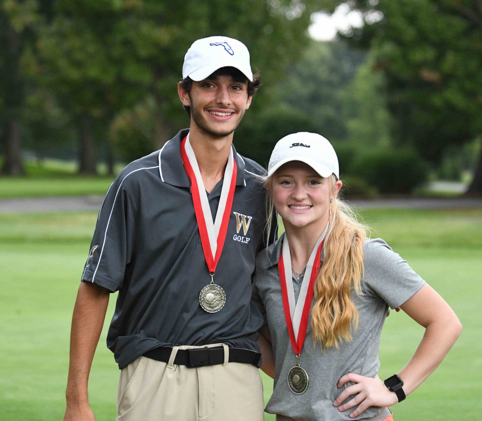 Staff photo / Brian Yauger Chalker’s Bella Woods (right) and Warren G Harding’s Anthony Payiavlas pose after winning the Trumbull County Golf Invitational at Trumbull County Country Club on Monday.