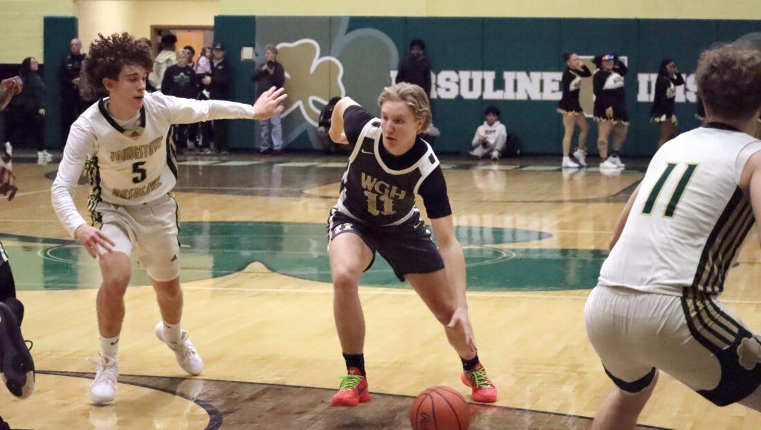 Correspondent photo / Lowell Spencer Warren G. Harding’s Jeremy Sampson (11) tries driving to the basket during a game on Monday against Ursuline at Ursuline High School in Youngstown.