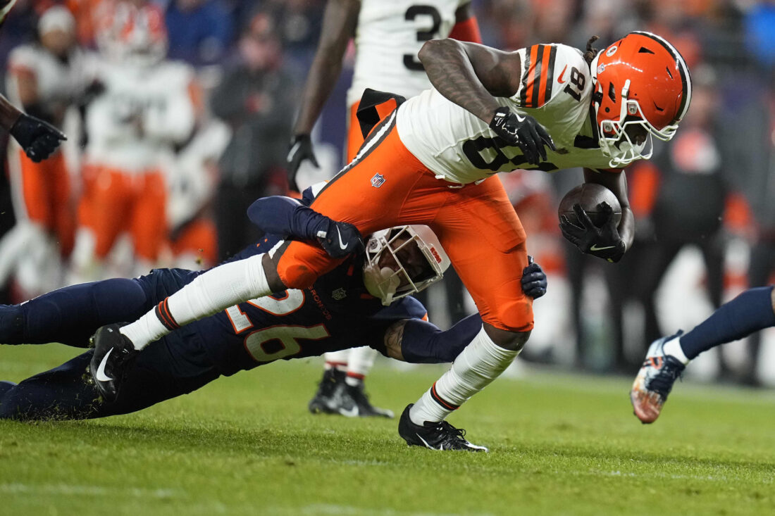 Cleveland Browns wide receiver Michael Woods II (81) is tackled by Denver Broncos safety Devon Key (26) during the second half of an NFL football game, Monday, Dec. 2, 2024, in Denver. (AP Photo/Jack Dempsey)