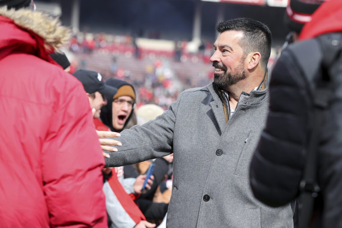 Ohio State Buckeyes head coach Ryan Day greets fans during the National Championship celebration at Ohio Stadium in Columbus, Ohio, Sunday, Jan. 26, 2025. (AP Photo/Joe Maiorana)