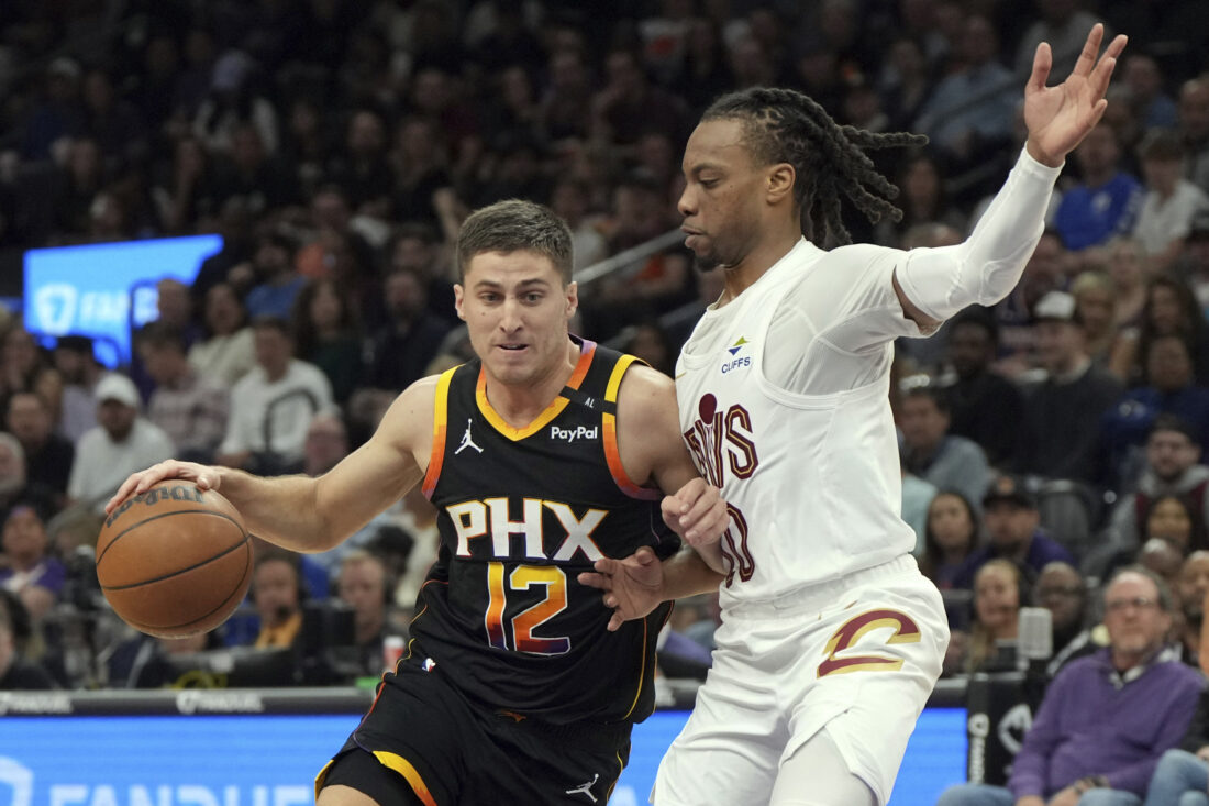 Phoenix Suns guard Collin Gillespie (12) drives on Cleveland Cavaliers guard Darius Garland during the first half of an NBA basketball game, Friday, March 21, 2025, in Phoenix. (AP Photo/Rick Scuteri)