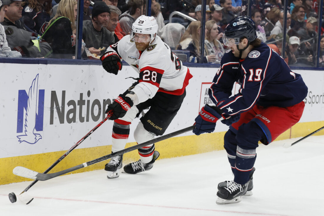 Ottawa Senators' Claude Giroux, left, and Columbus Blue Jackets' Adam Fantilli chase the puck during the first period of an NHL hockey game Tuesday, April 8, 2025, in Columbus, Ohio. (AP Photo/Jay LaPrete)