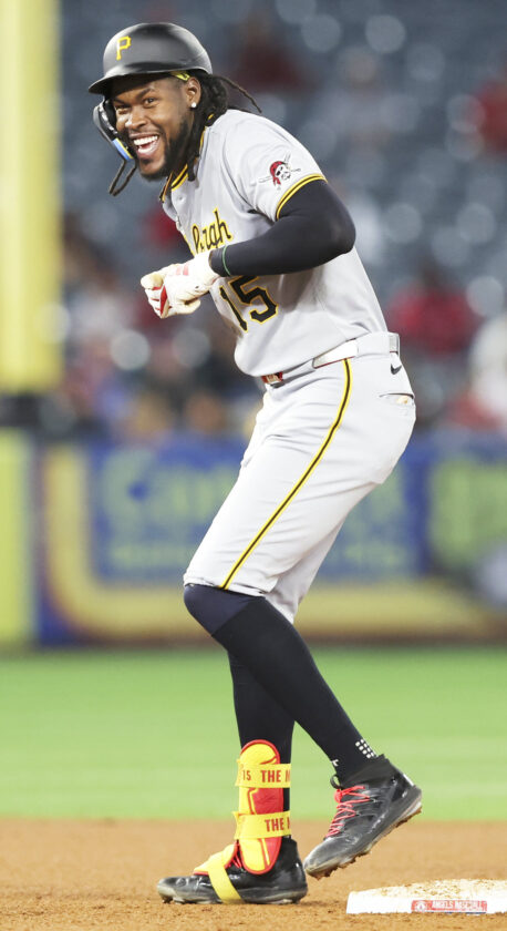 Pittsburgh Pirates' Oneil Cruz reacts on second base after hitting a double during the fifth inning of a baseball game against the Los Angeles Angels in Anaheim, Calif., Tuesday, April 22, 2025. (AP Photo/Jessie Alcheh)