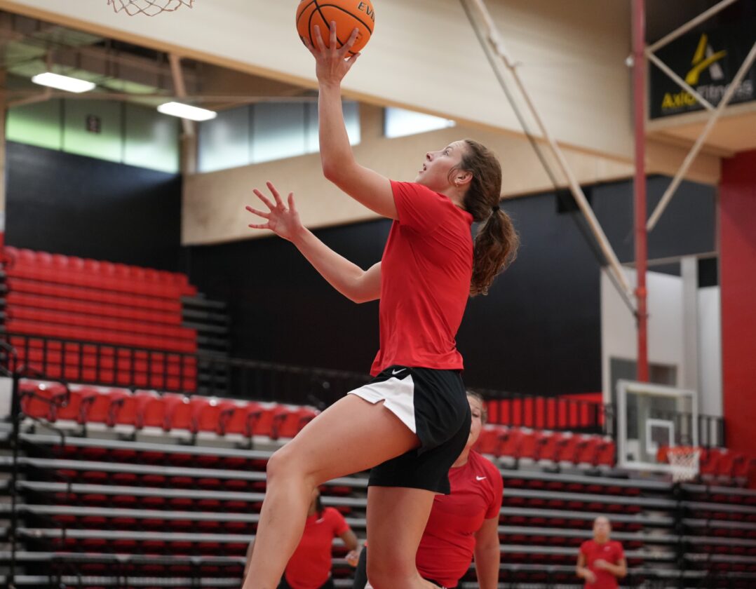 Photo courtesy of YSU Athletic Communications / Madison Chapman. YSU sophomore forward Sophia Gregory goes through layup drills during the Penguins’ first full on-court practice of the summer on Wednesday at Zidian Family Arena at Beeghly Center.