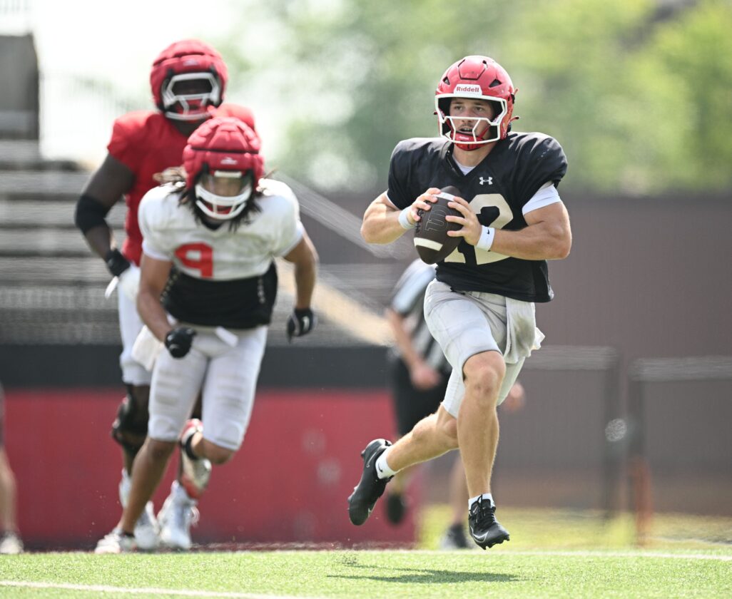 Correspondent photo / Robert Hayes. YSU quarterback Beau Brungard eludes a defender and looks downfield during Penguins scrimmage during fall camp at Stambaugh Stadium.