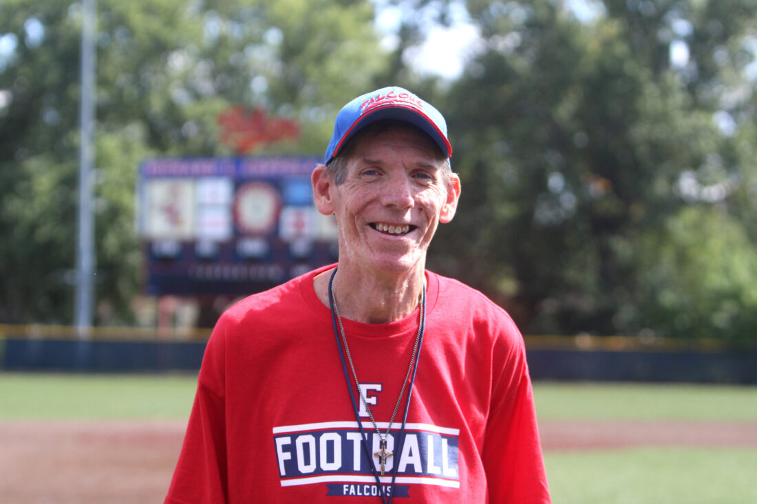 He’s an assistant coach for the middle school football team, and he handles the clock for soccer games, volleyball matches, freshman football games and middle school basketball. When the spring rolls around, he makes sure the umpires have baseballs and keeps track of pitch counts with an old clicker counter when the Falcons take the diamond. He does all of this, in addition to helping the boys basketball team with its jerseys, water and locker room maintenance in the winter.