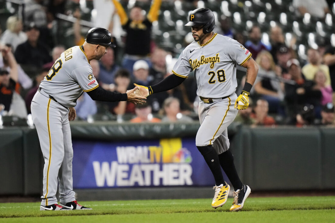 Pittsburgh Pirates' Tommy Pham (28) celebrates with third base coach Mike Rabelo, left, after hitting a home run during the ninth inning of a baseball game against the Baltimore Orioles, Tuesday, Sept. 9, 2025, in Baltimore. (AP Photo/Stephanie Scarbrough)