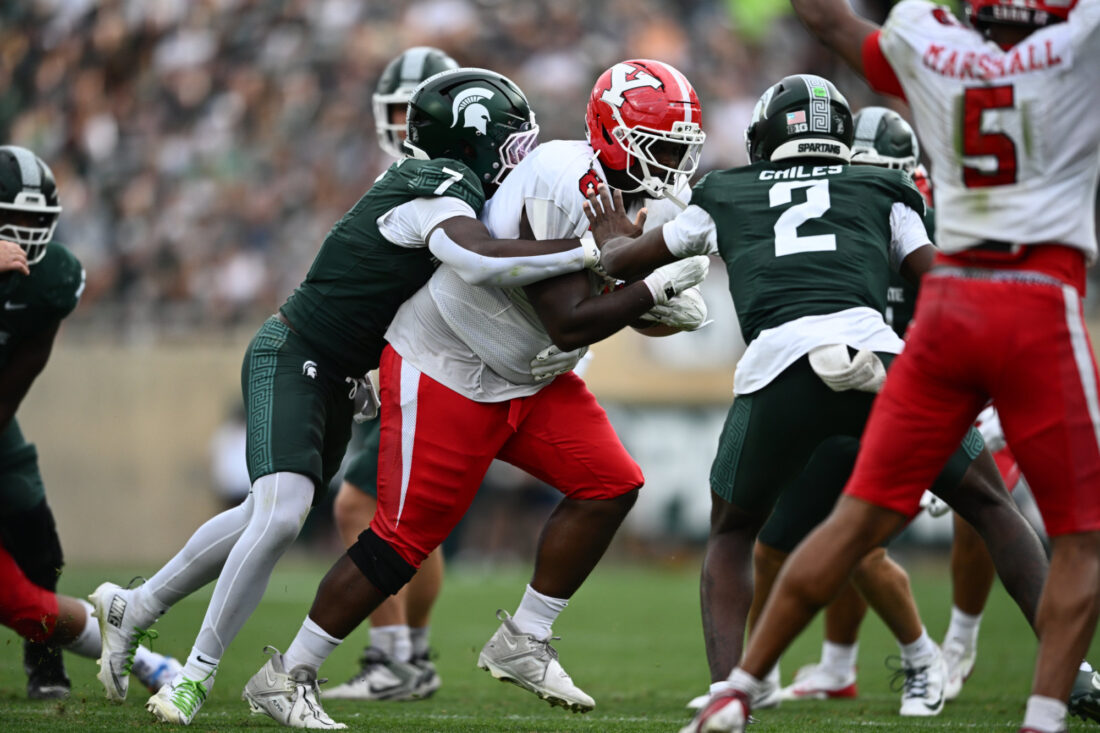Correspondent photo / Robert Hayes. YSU defensive tackle Cameron Cunningham (8) is tackled by Michigan State’s Brandon Tullis (7) and Aidan Chiles (2) after intercepting Chiles’ pass, which was tipped by linebacker Carston Marshall (5) on Saturday in East Lansing, Mich.