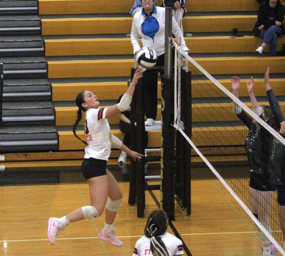 Staff photo / Dan Hiner Fitch’s Kylie Folkwein attempts to push the ball over a block attempt during the third set of a Division II district semifinal on Monday.