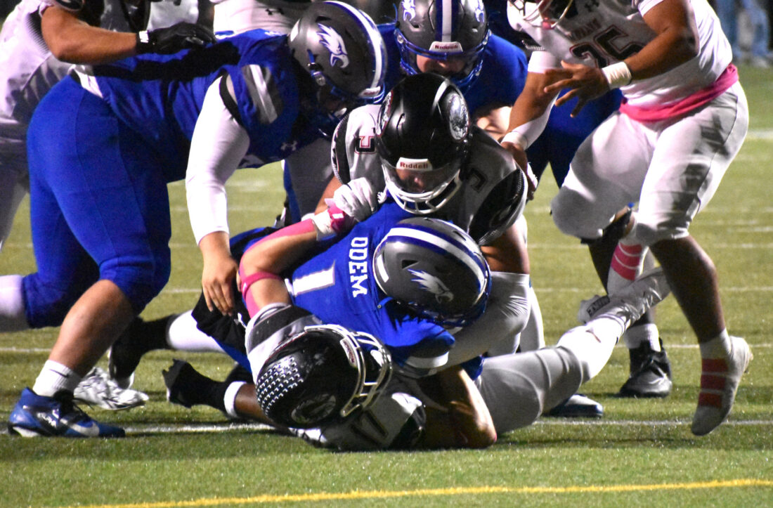 Facing fourth-and-one at the Indians’ 31, the Eagles converted with a short run by quarterback Braydon Songer before Mike Hazimihalis carried the ball for 9 yards and then, on the ninth play of the drive and first of the second quarter, rushed for a 14-yard touchdown. The ensuing extra point failed, with a high snap preventing kicker Caleb Mackay from making an attempt and keeping the Eagles down 7-6.