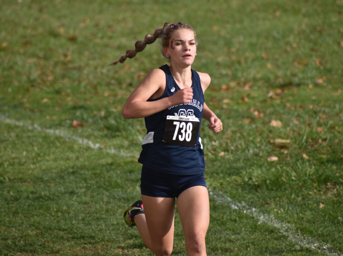 Staff photo / Preston Byers. McDonald’s Naomi Sheesley approaches the finish line during the Division IV girls race at the OHSAA regional cross country meet on Saturday at Boardman High School.