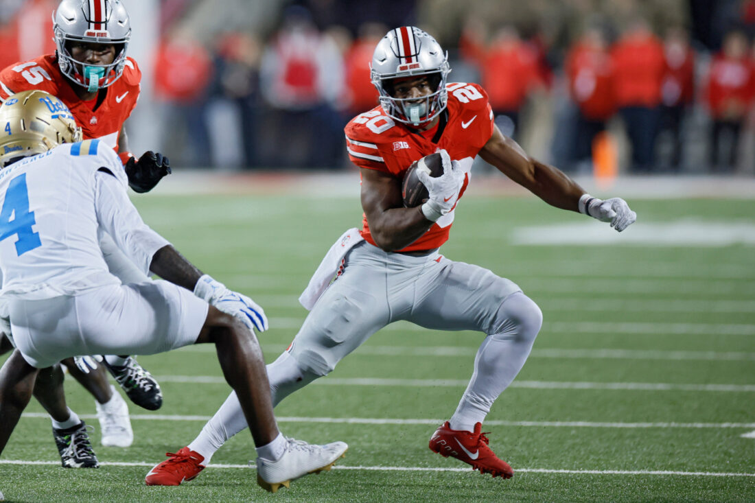 Ohio State running back James Peoples plays against UCLA during an NCAA college football game, Saturday, Nov. 15, 2025, in Columbus, Ohio. (AP Photo/Jay LaPrete)