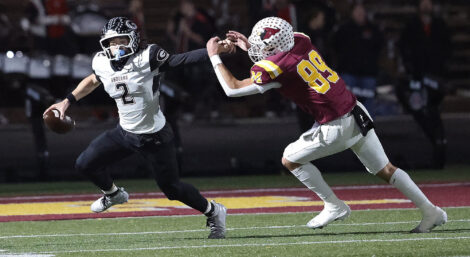 Correspondent photo / Michael G. Taylor Girard quarterback AJ Pearson (2) escapes pressure from Cardinal Mooney’s John Brenner during Friday’s Division V regional final against Girard at South Range.