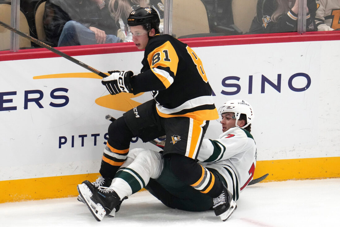Pittsburgh Penguins' Ben Kindel (81) collides with Minnesota Wild's Brock Faber, bottom, during the third period of an NHL hockey game in Pittsburgh, Friday, Nov. 21, 2025. (AP Photo/Gene J. Puskar)