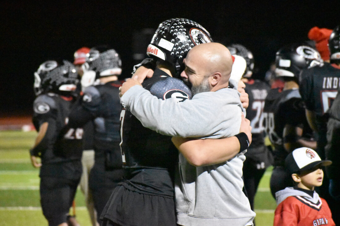 Staff file photo / Preston Byers Girard head football coach Pat Pearson (right) hugs his son, Indians starting quarterback AJ Pearson, after Girard’s regional semifinal victory vs. Poland on Nov. 14. The Indians face Cardinal Mooney in a Division V regional championship game tonight at South Range.