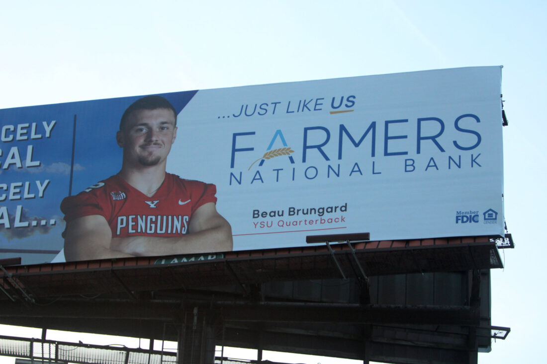 Staff photo / Dan Hiner A Farmers National Bank billboard featuring Youngstown State quarterback Beau Brungard, which sits facing Interstate 680 in Youngstown.