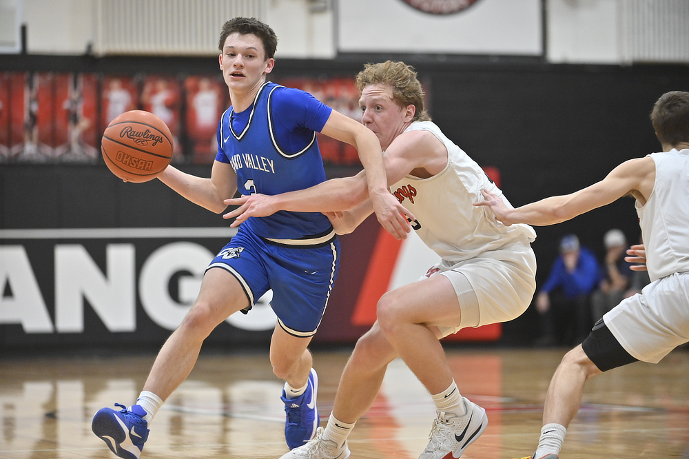 Staff photo / Brian Yauger Grand Valley’s Evan Skates, left, dribbles past Mathews sophomore Caden Brubaker during Tuesday’s game at Mathews High School.