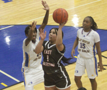 Staff photo / Dan Hiner East Palestine’s Jacklyn Ogle (1) goes up for a layup during overtime of Thursday’s game against Valley Christian in Youngstown.
