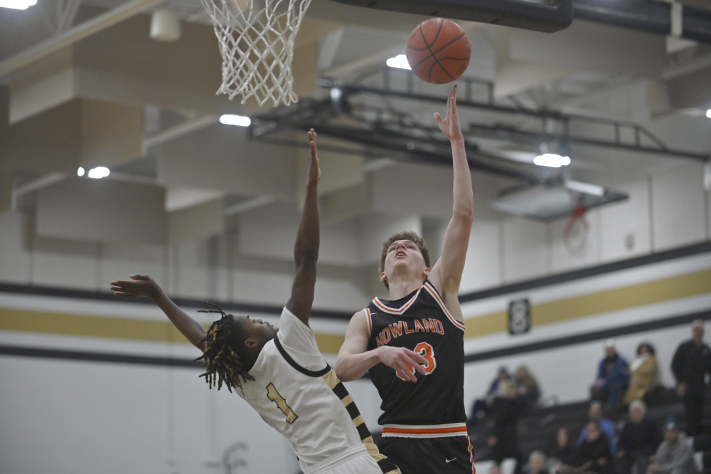 Staff photo / Brian Yauger Howland junior Jackson Mickel, right, goes for a layup in the first half past the defense of Harding’s Khi Evans during Tuesday’s game at Warren G. Harding High School.