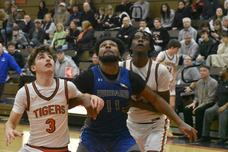 Staff file photo / Preston Byers Hubbard’s Jakob Hayes (11) tries to box out a pair of Howland defenders during a game at Howland High School on Jan. 2.