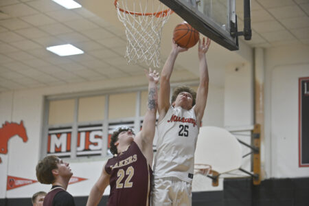 Staff photo / Brian Yauger Mathews sophomore Dane Brubaker (25)goes for a layup while being defended by Pymatuning Valley’s Chase Guysinger during a game Friday in Vienna.