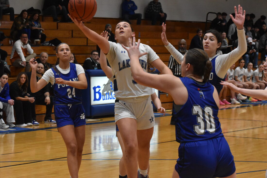 Staff photo / Preston Byers Lakeview’s Kalyssa Werner lays the ball up amid a group of Poland defenders during Lakeview’s win Monday in Cortland.
