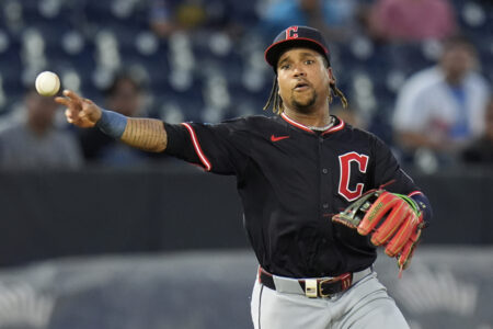 Cleveland Guardians third base José Ramírez throws out Tampa Bay Rays' Yandy Díaz at first during the first inning of a baseball game Thursday, Sept. 4, 2025, in Tampa, Fla. (AP Photo/Chris O'Meara)