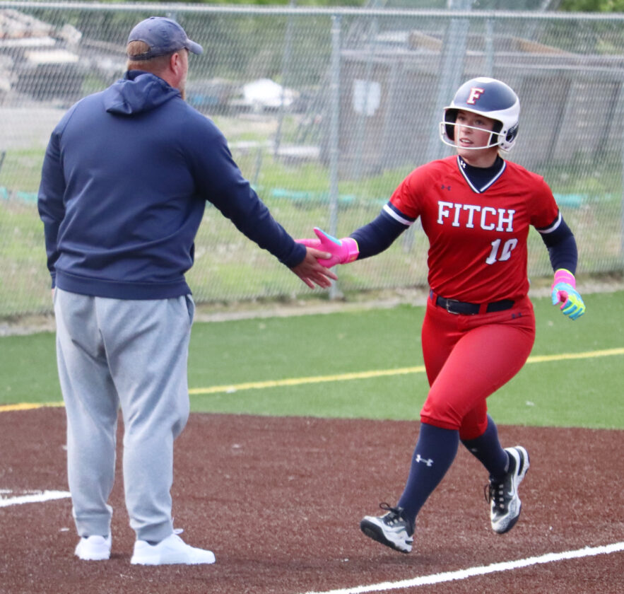 Staff file photo / Neel Madhavan Fitch’s Abby Toth high-fives head coach Steve Ward after hitting a solo home run against Canfield last season in Austintown.