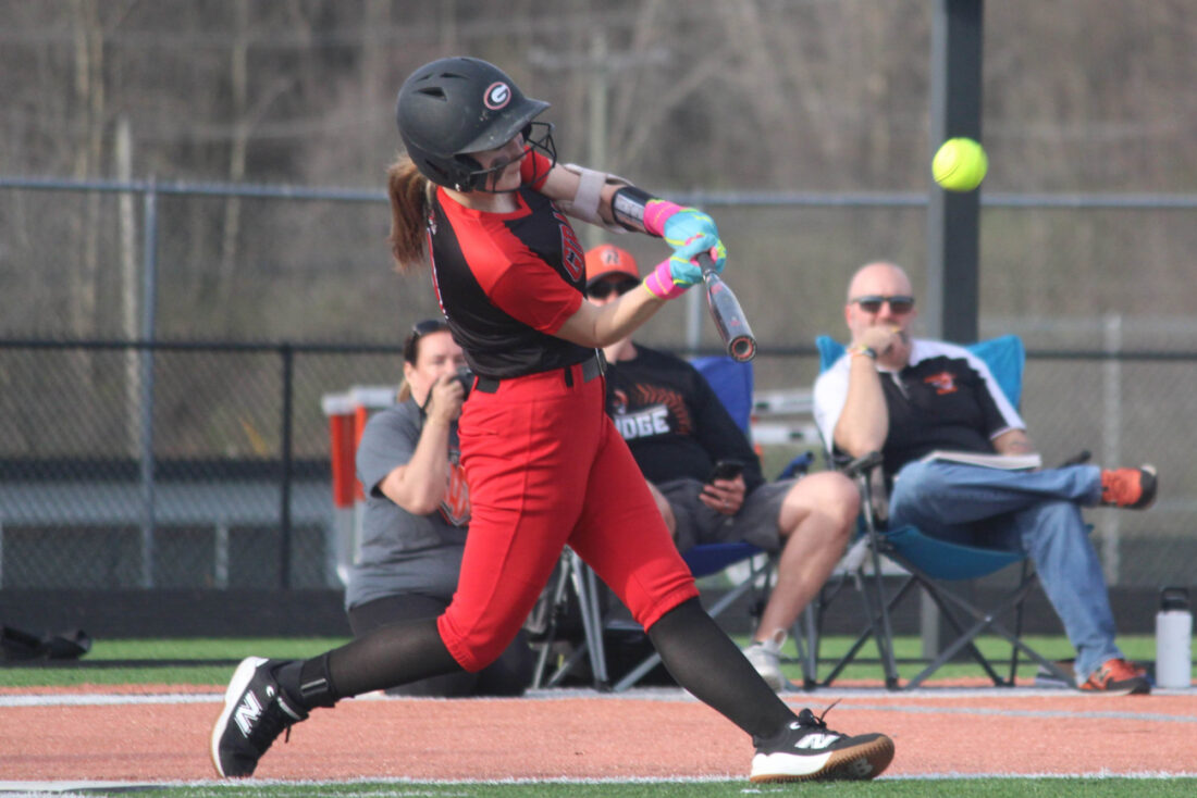 Staff photo / Dan Hiner Girard’s Gianna Saxon hits a grand slam during the second inning of Thursday’s game against Mineral Ridge at Joe Lane Stadium in Weathersfield.
