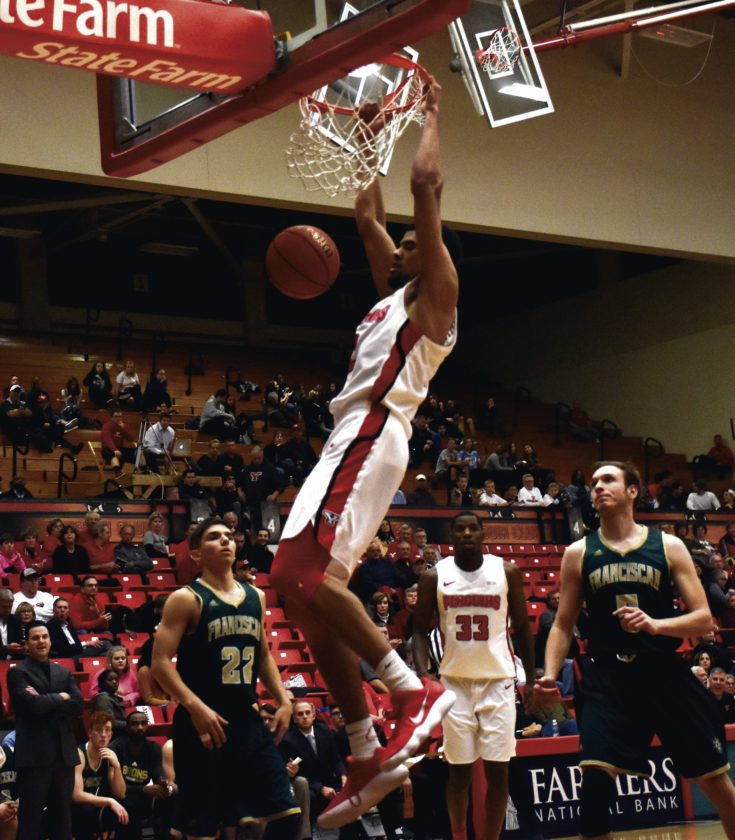 Robinson and Morse pressured a Franciscan player outside the 3-point arc. The squeeze on the Barons player was too much to bear as he threw an errant pass into the hands of Hartfield. The YSU sophomore wing found open space, dribbled toward the empty basket, rose up, gripped the ball with his right hand, secured it with his left and slammed the ball with both hands.